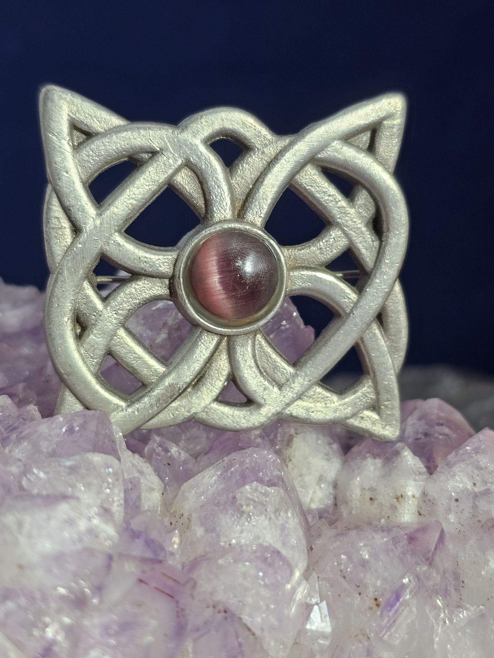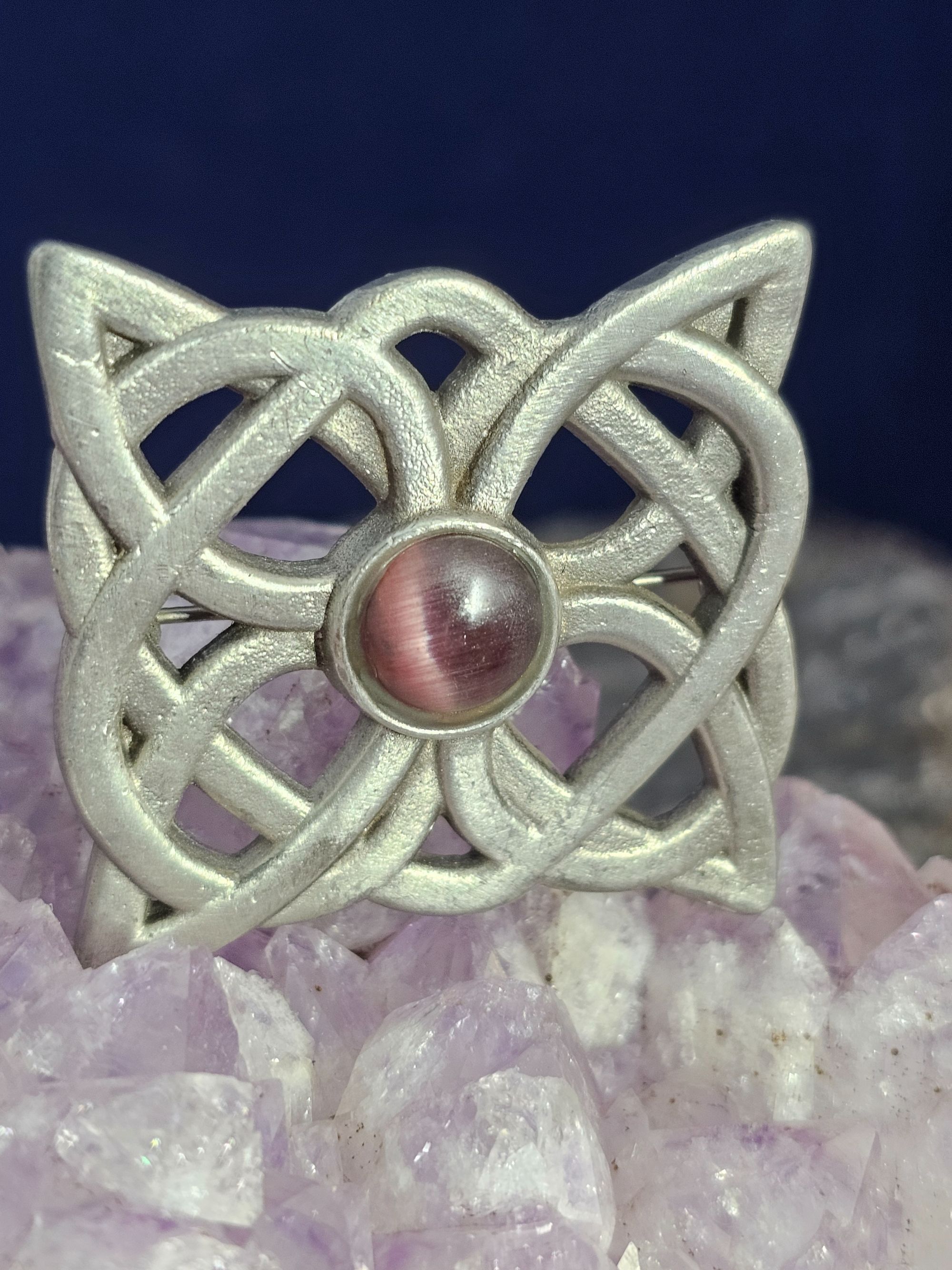 This beautiful Celtic knot brooch frames a stunning purple (mauve) glass cat eye cabochon. The color purple often represents intuition, calm; while Celtic knots are continuous paths symbolizing eternity.