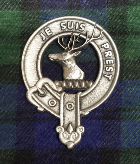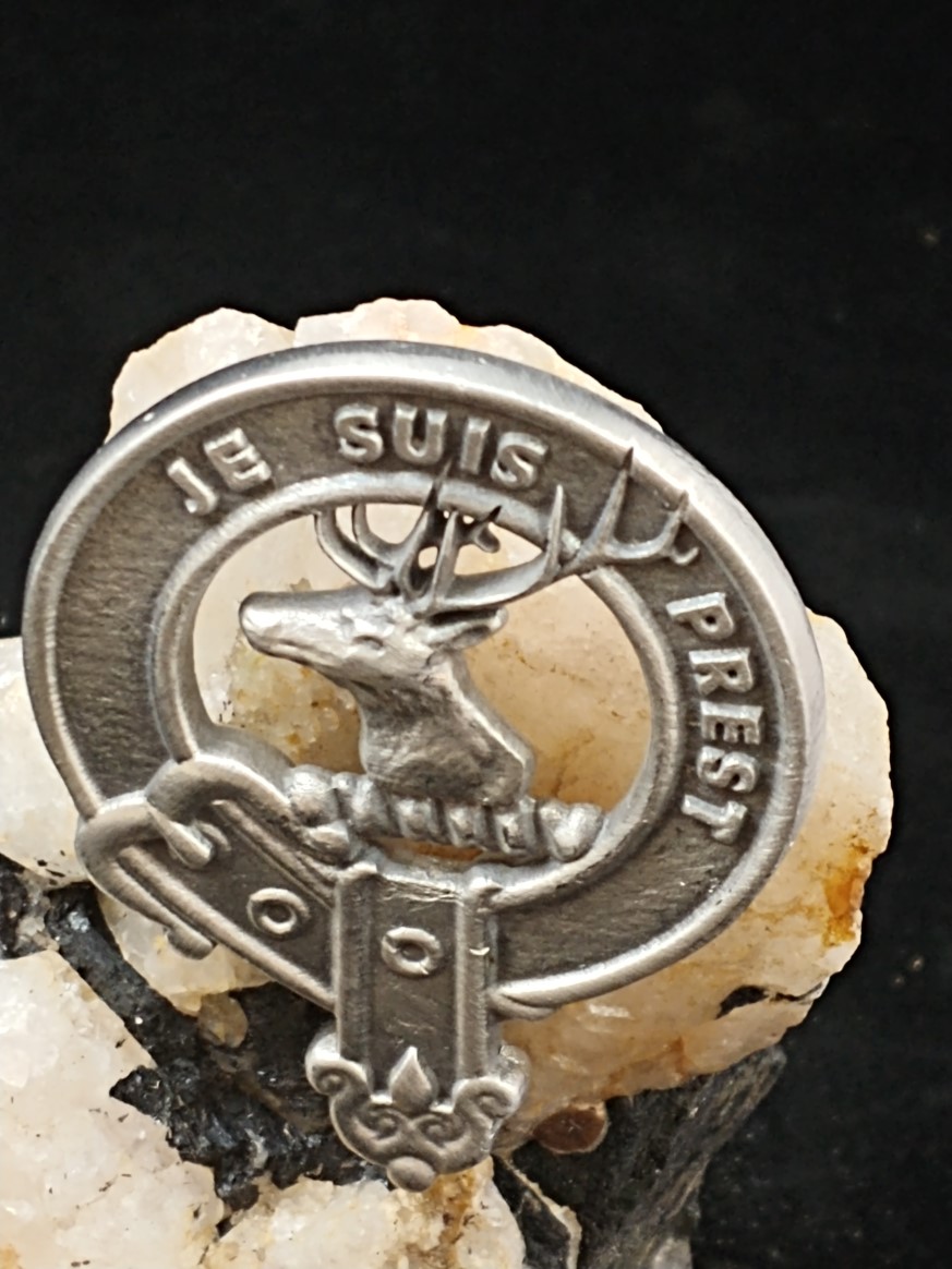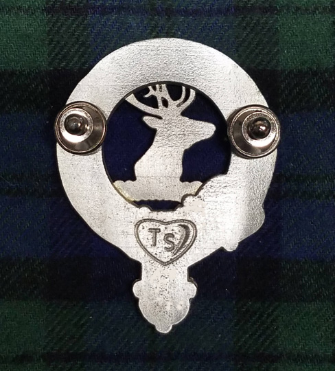 Hand cast and hand finished out of lead-free Britannia Pewter. This clan badge measures 1-5/8" x 2-1/8". This brooch features 2 push pin backings.