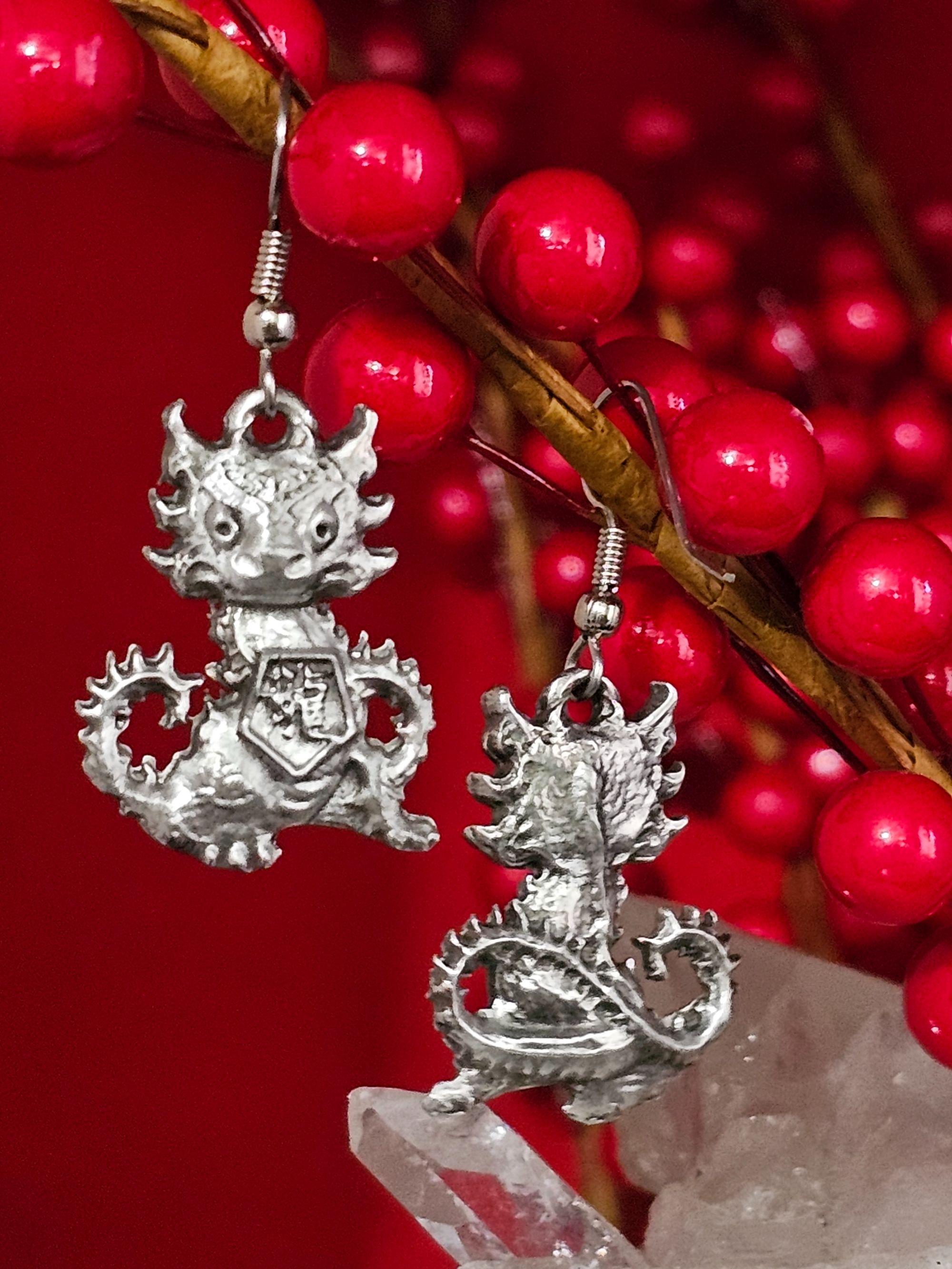 Celebrating the Year of the Dragon, these hand cast pewter dragon earrings are a charming edition to your collection. 2024 Lunar or Chinese New Year brings the year of the Wood Dragon. The Dragon is the 5th symbol of the Chinese New year which runs in 12 year intervals. If you were born in 1940, 1952, 1964, 1976, 1988, 2000, 2012, 2024 you were born in the year of the Dragon. Additionally, in Chinese element theory, each zodiac sign is associated with one of the five elements: Metal, Wood, Water, Fire, and Earth. 2024 is the year of Dragon based on Chinese zodiac. It's the year of wood dragon starting from Feb.10, 2024 to Jan.28, 2025. Dragons are confident, resolute, strong, and proud.