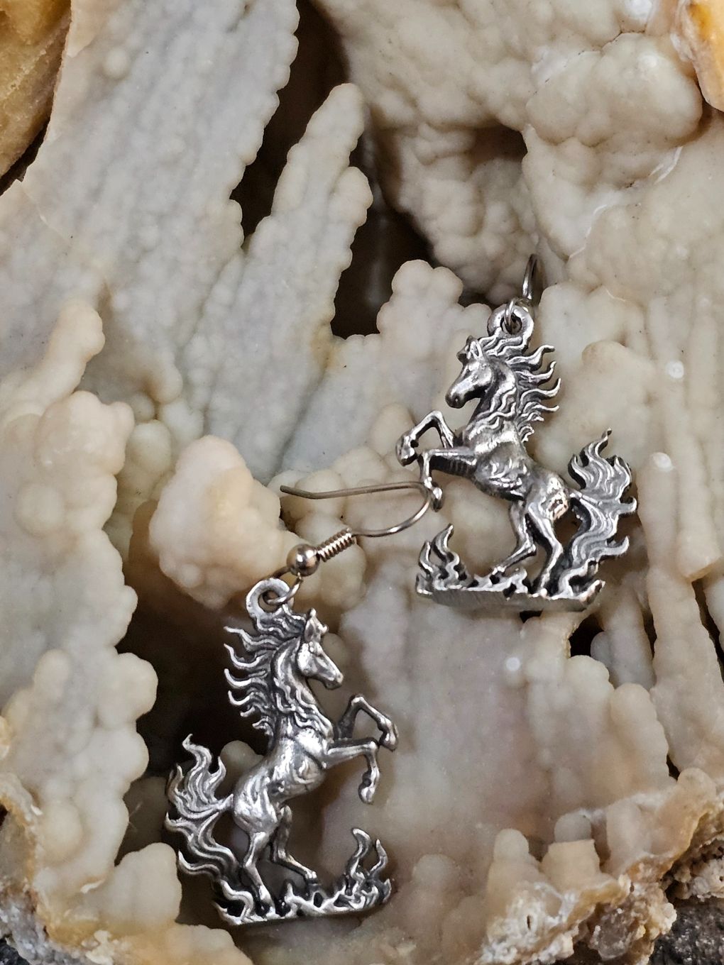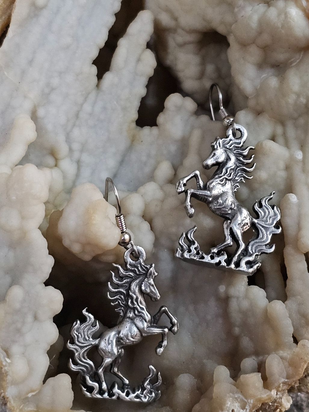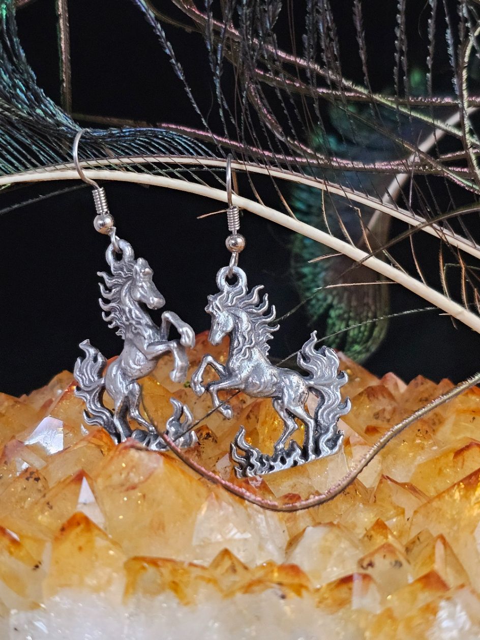 Cast in lead free pewter this stunning fire horse is ready to lead you into your new adventures. The earring charms are double sided and measure 1 1/4" X 7/8" the earring wires are surgical steel. Special note: these will be a bit heavier than commercially sold earrings.