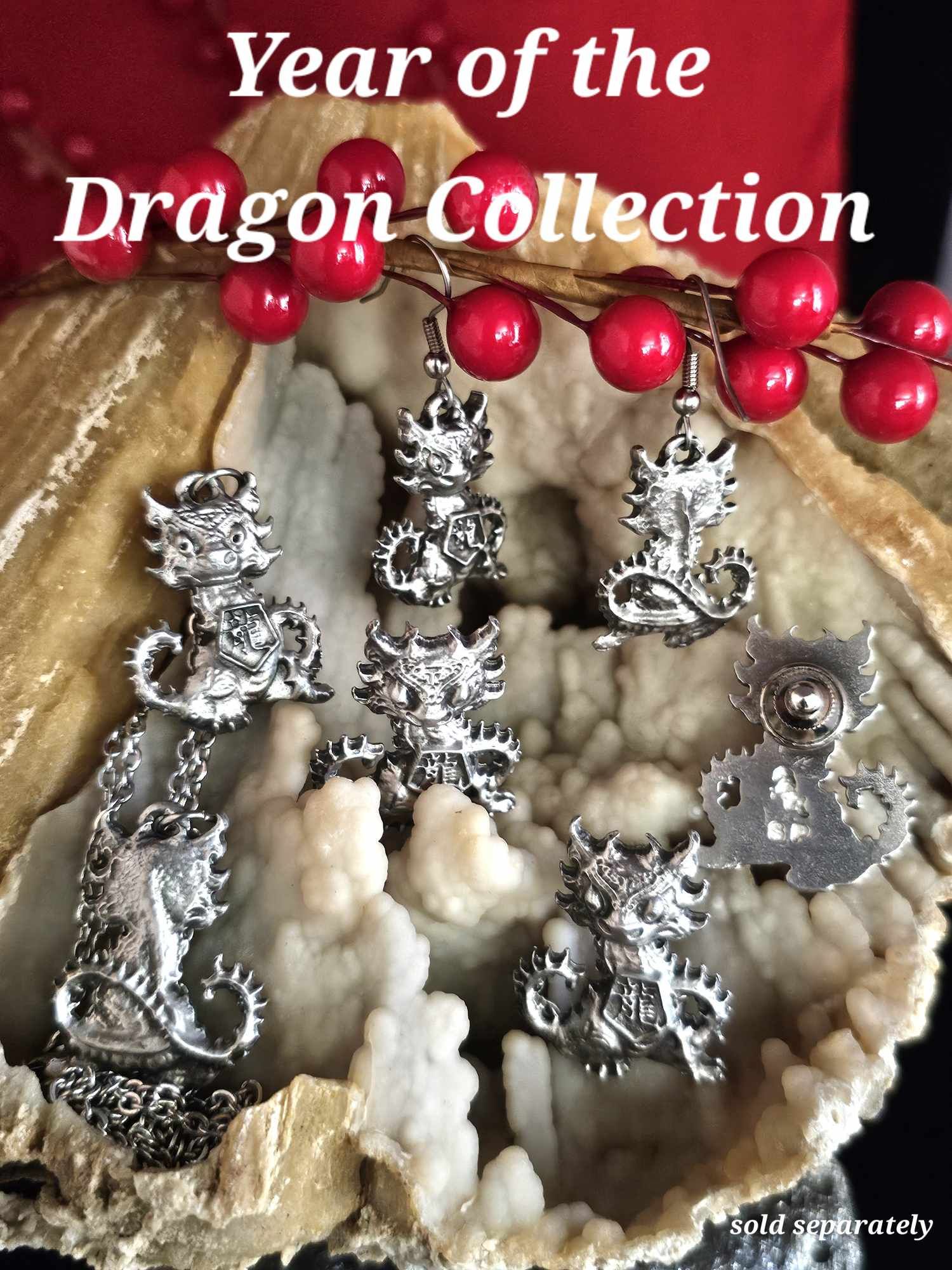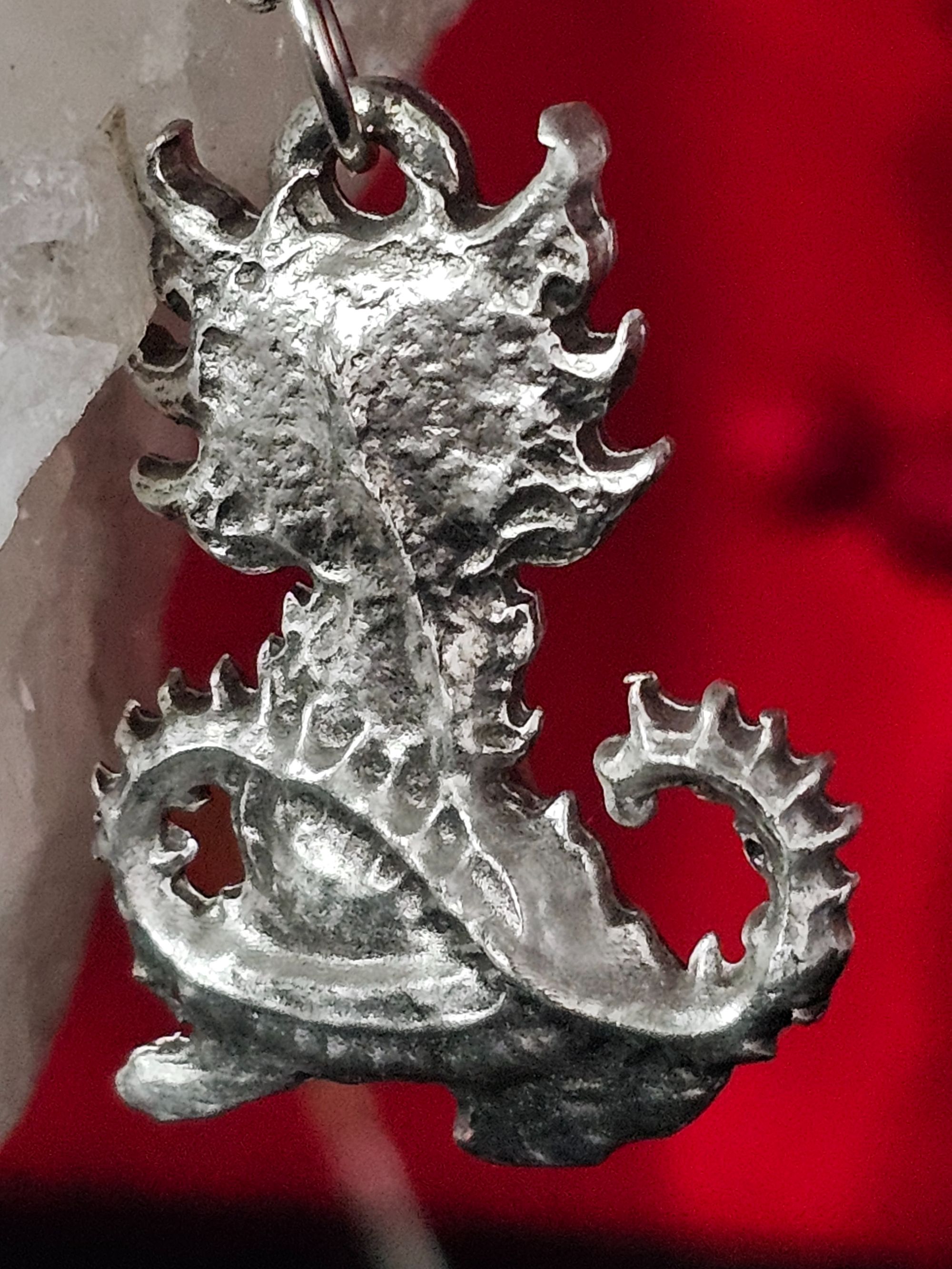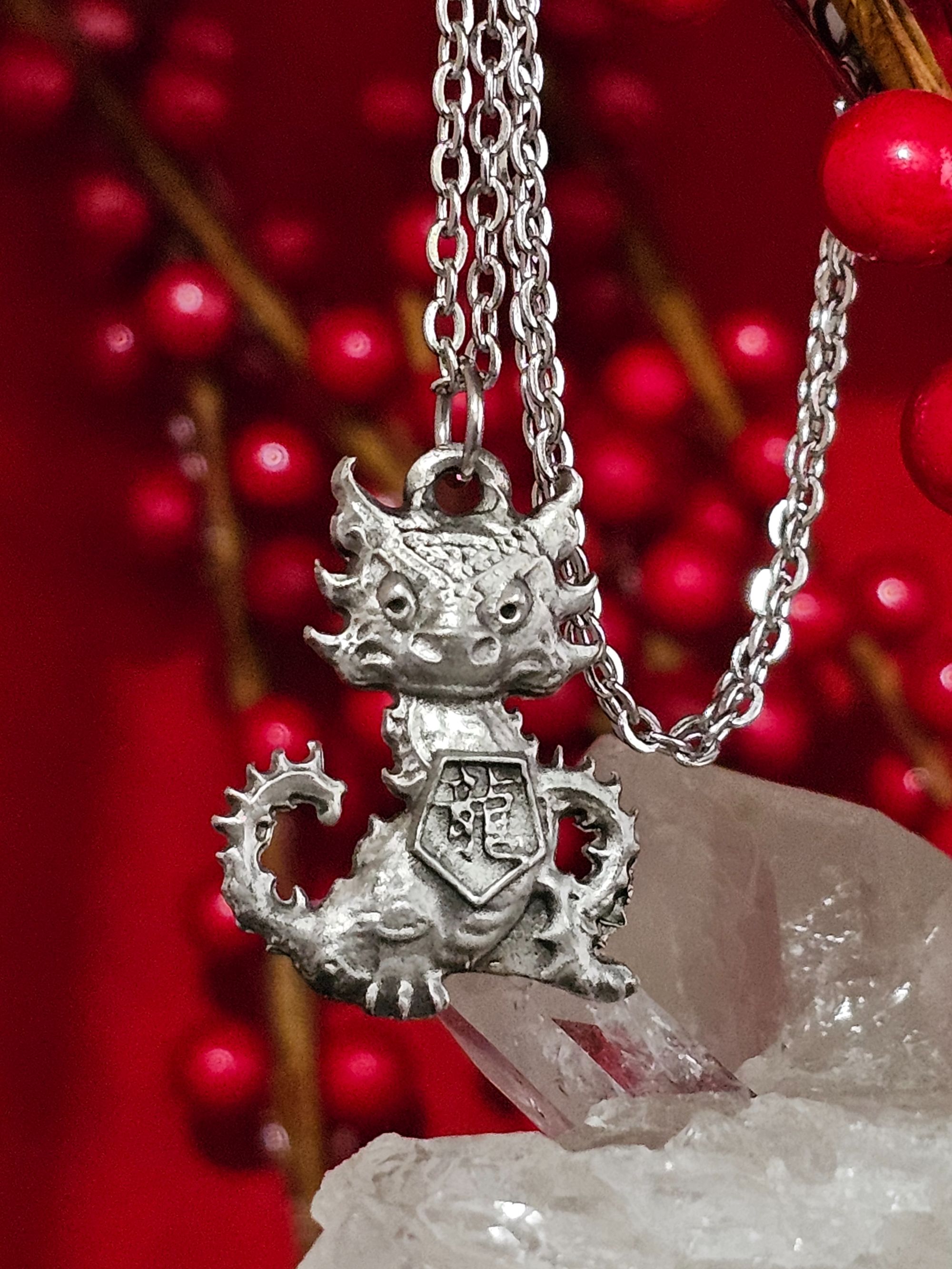 Celebrating the Year of the Dragon, this hand cast pewter dragon necklace is complete with an 18 in chain. 2024 Lunar or Chinese New Year brings the year of the Wood Dragon. The Dragon is the 5th symbol of the Chinese New year which runs in 12 year intervals. If you were born in 1940, 1952, 1964, 1976, 1988, 2000, 2012, 2024 you were born in the year of the Dragon. Additionally, in Chinese element theory, each zodiac sign is associated with one of the five elements: Metal, Wood, Water, Fire, and Earth. 2024 is the year of Dragon based on Chinese zodiac. It's the year of wood dragon starting from Feb.10, 2024 to Jan.28, 2025. Dragons are confident, resolute, strong, and proud.