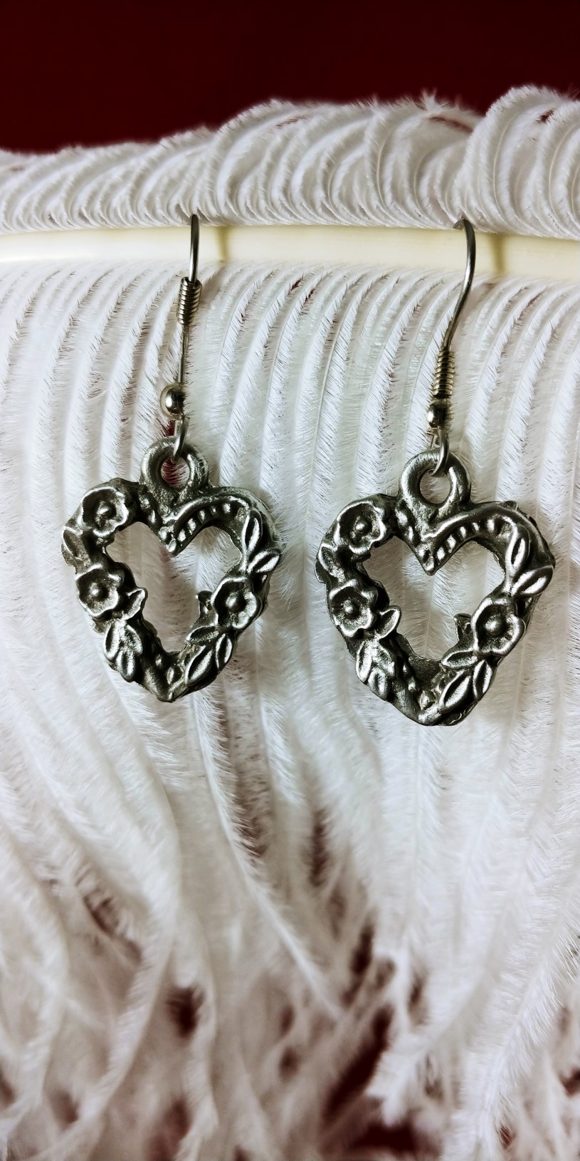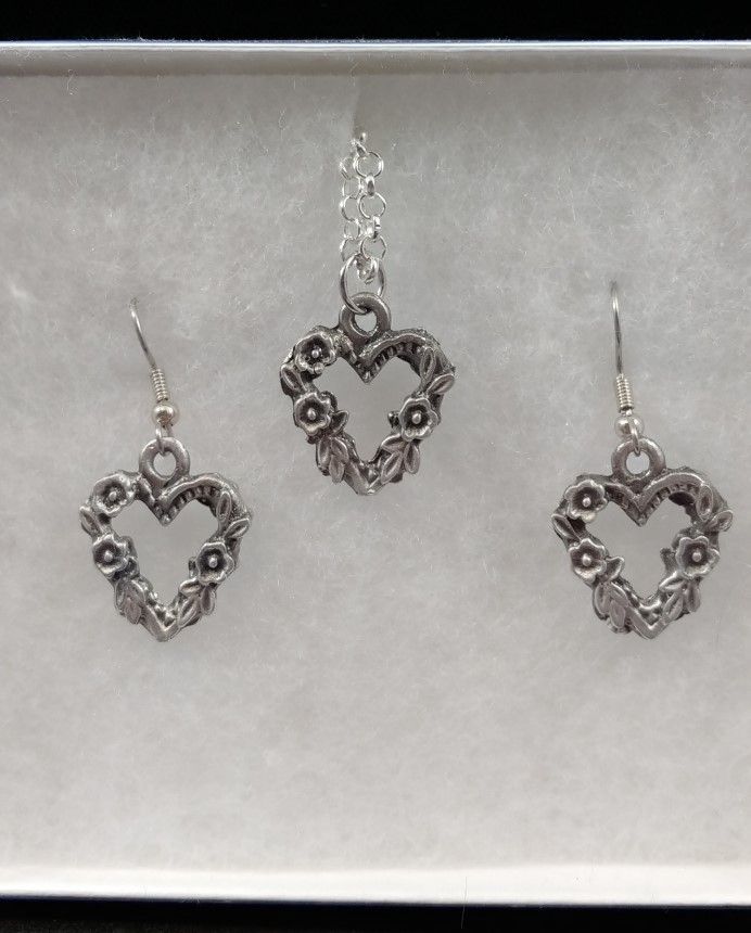 Romantic Roses set in a heart shape in this set hand-cast pewter earrings. Perfect for every day or a romantic adventure.