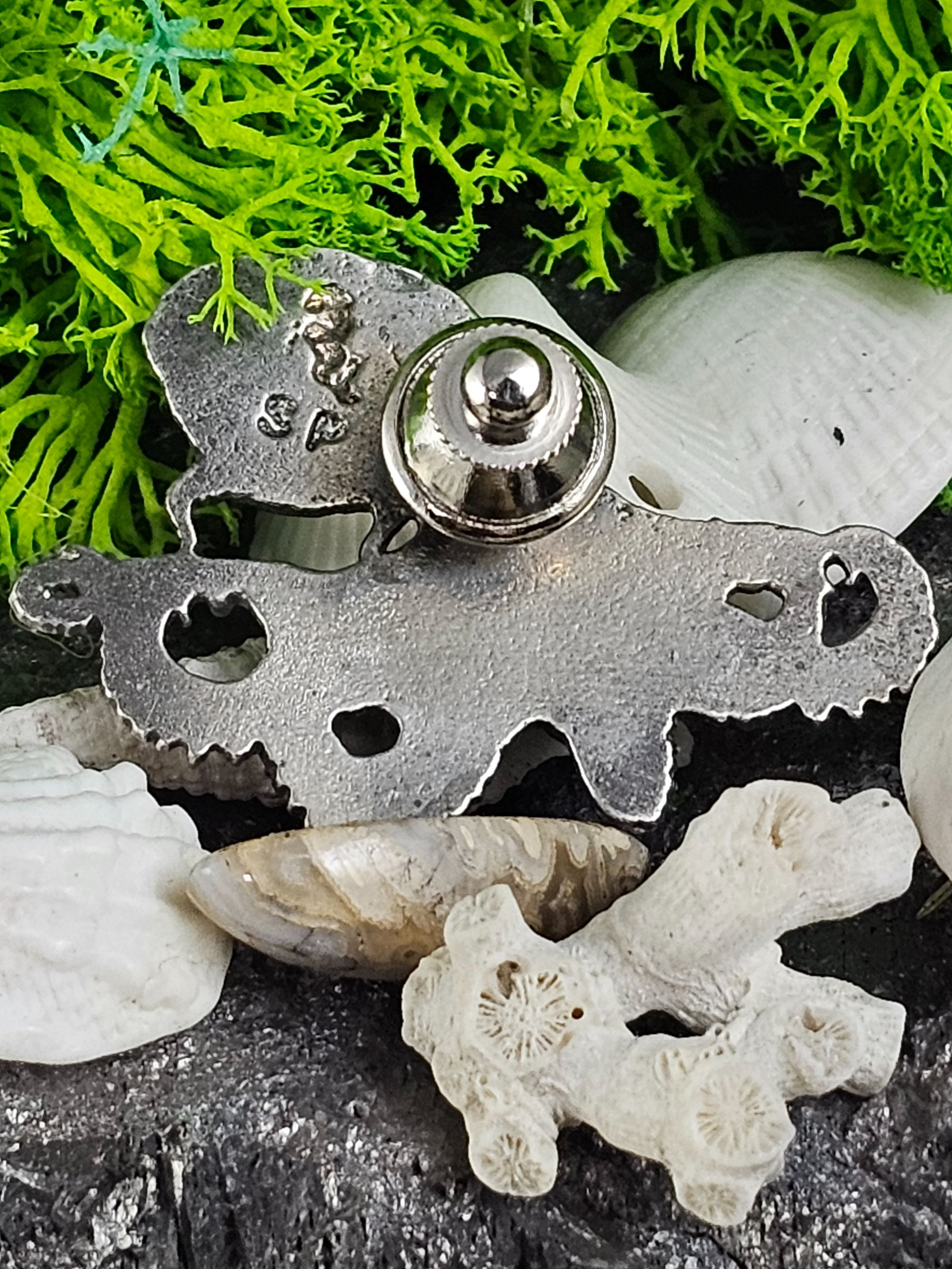 The pin is aprox. 1" X 1 1/2" and is made of hand cast, lead free pewter. Locking pin post backing.
