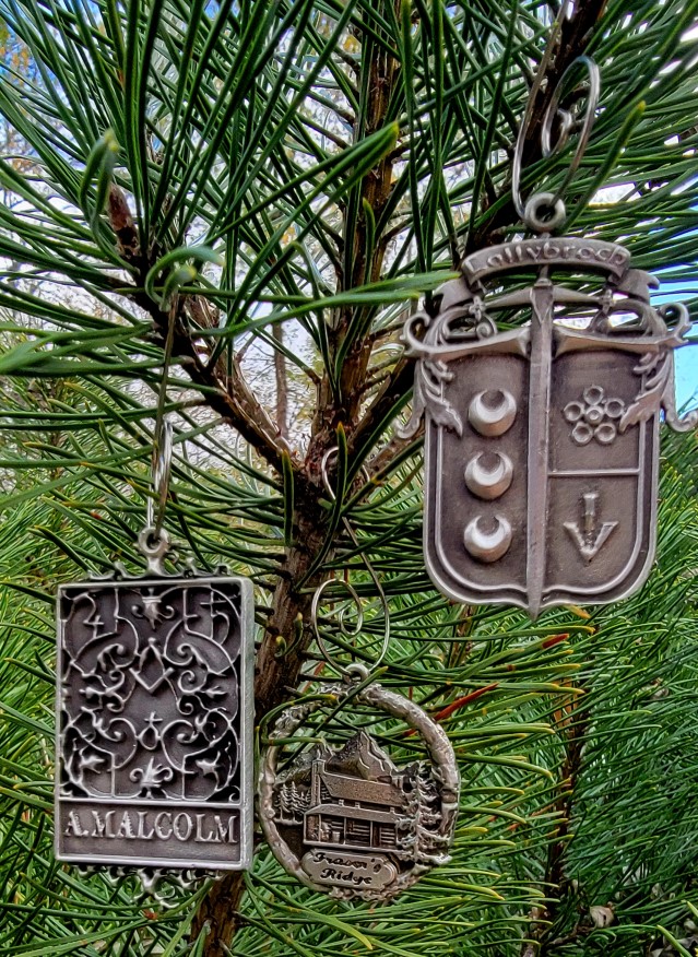 Included in set: TWO 2 1/4" Lallybroch ornament , TWO 2 1/2" A. Malcolm ornament and TWO 1 3/4" Fraser Ridge ornament