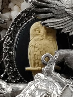 The owl spirit animal represents the deep connection shared with wisdom, good judgment, knowledge, insight and intuition. The meaning of the owl also relates to change or transition. The Owl is an ivory on black resin cameo set in hand – cast pewter.