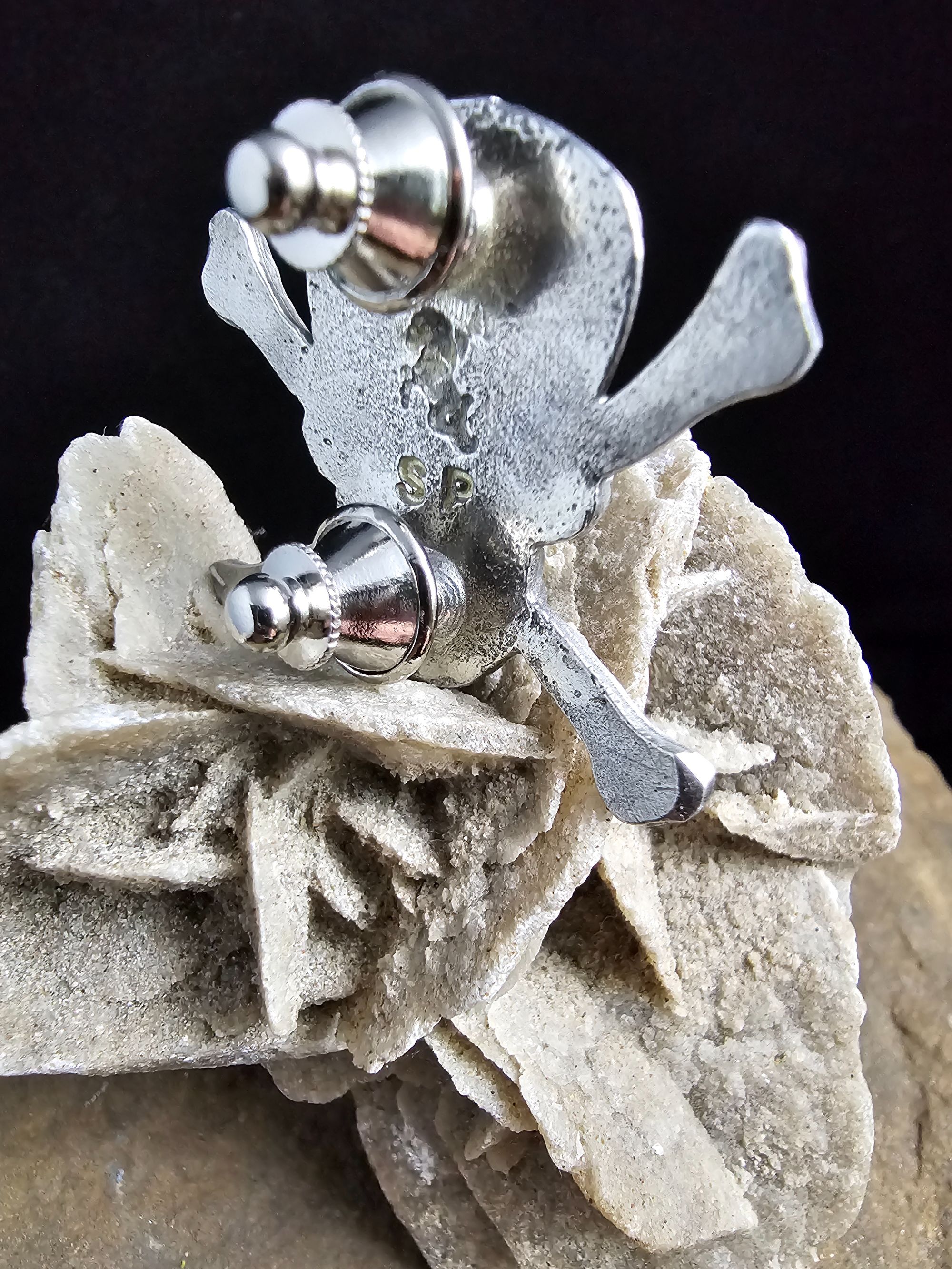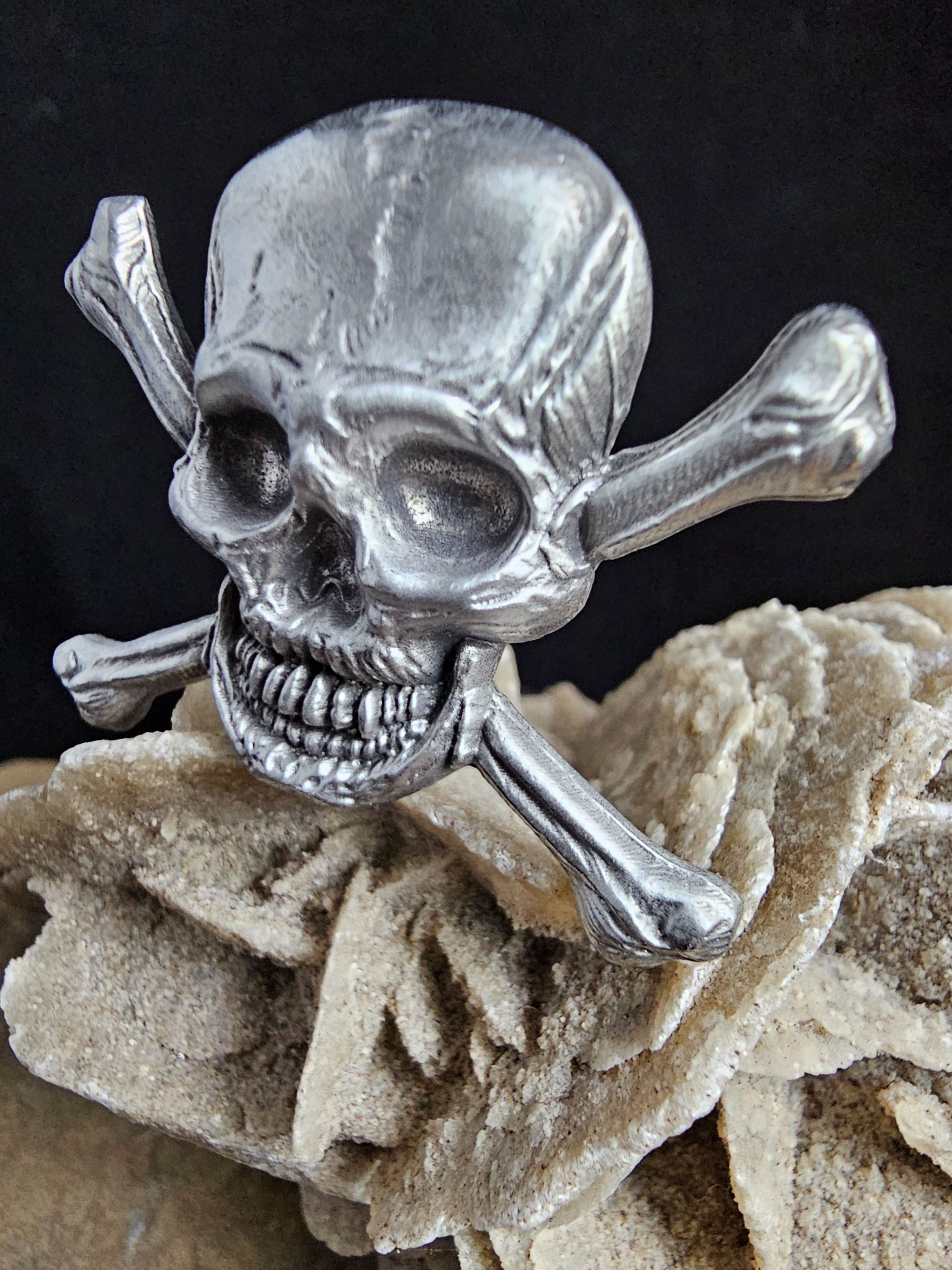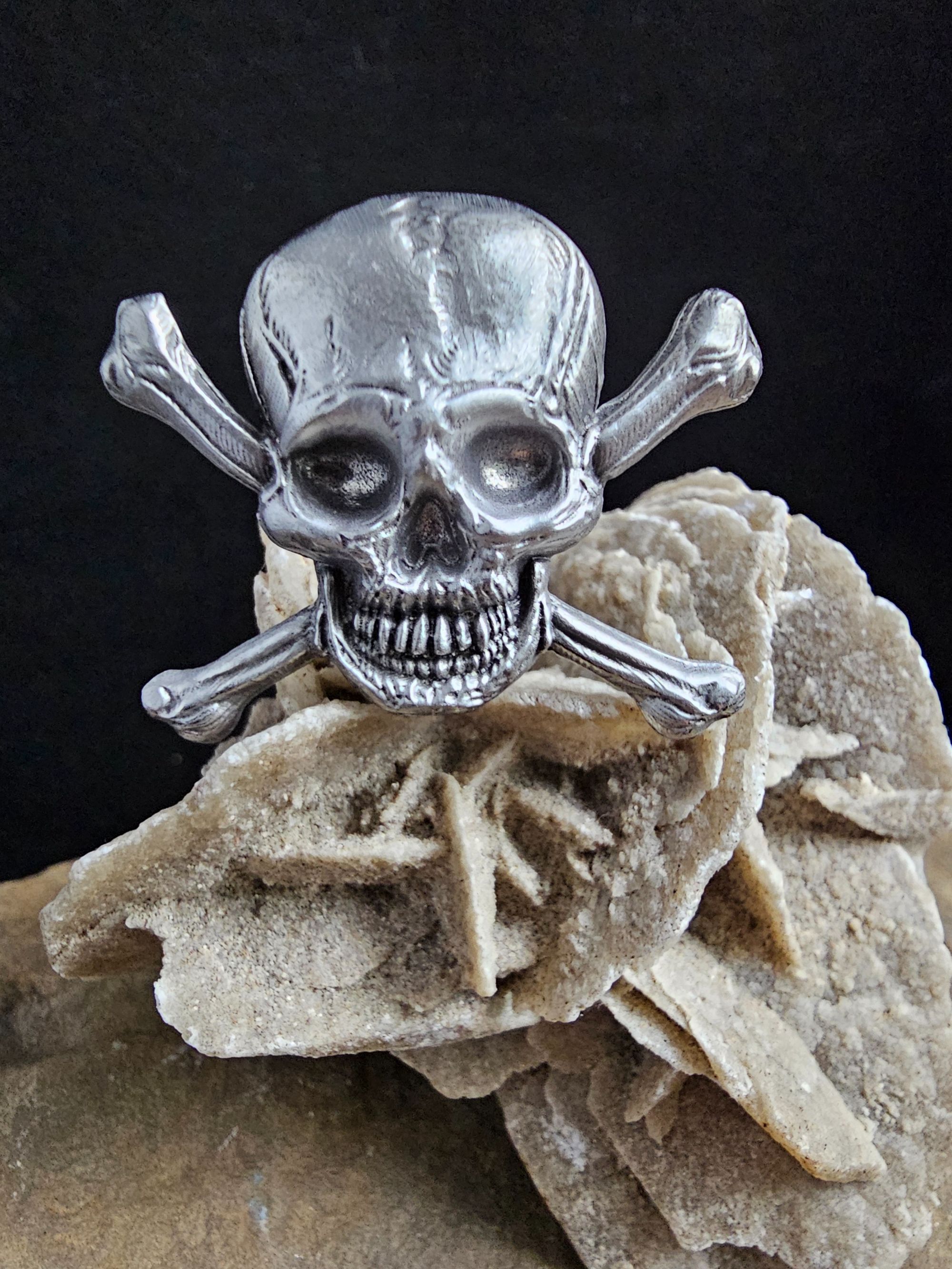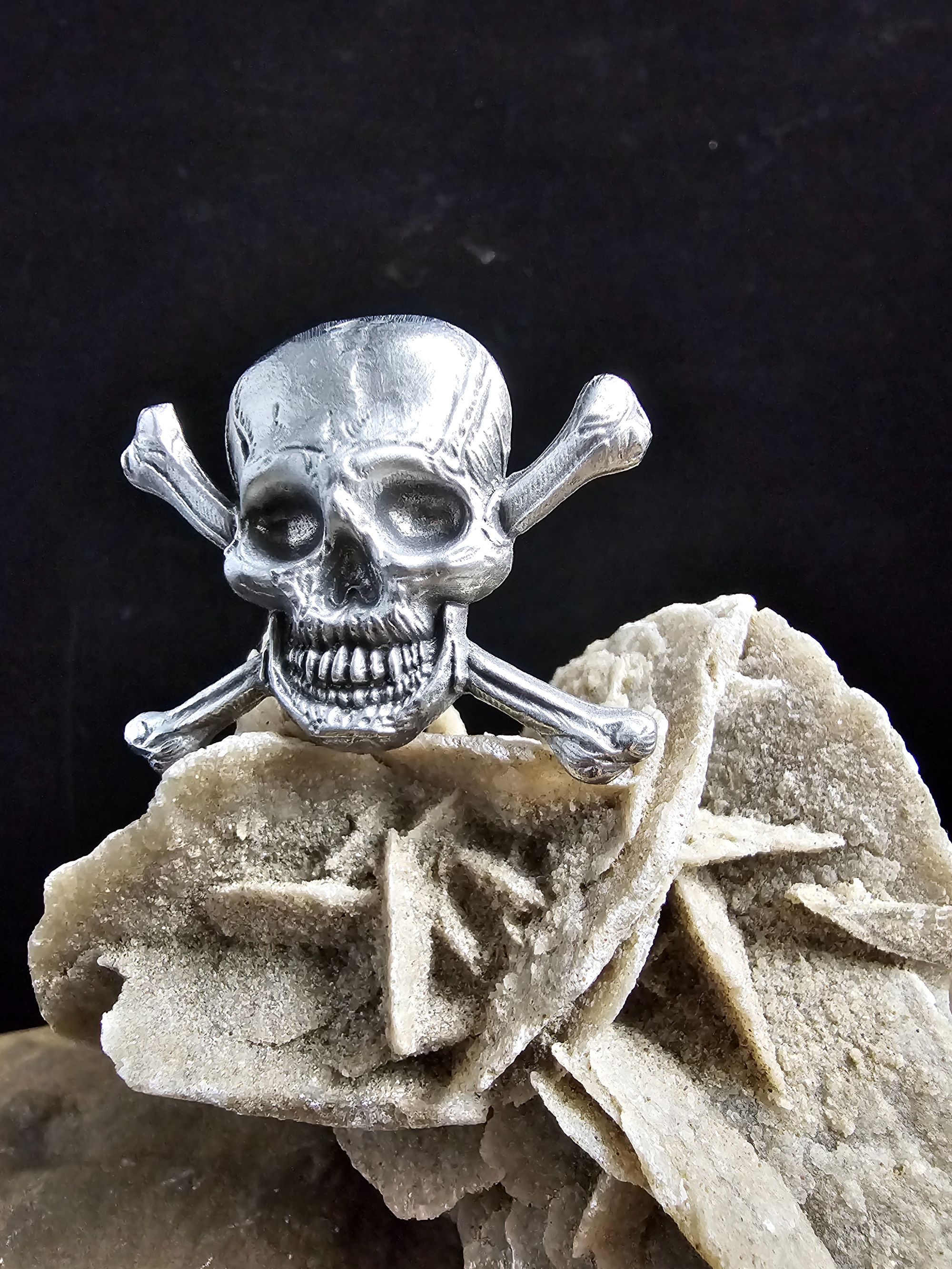 This hand-cast pewter skull and crossbones pin would be perfect for a tri-horn, hat, leather vest or bag. Two locking pin caps keep it secure.