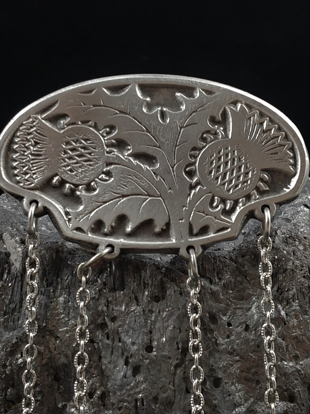 The humble thistle is the national symbol of Scotland. The thistle chatelaine measures 3" x 1-3/4", there are 4 hanging 6" heavy duty stainless steel chains and lanyard clips.