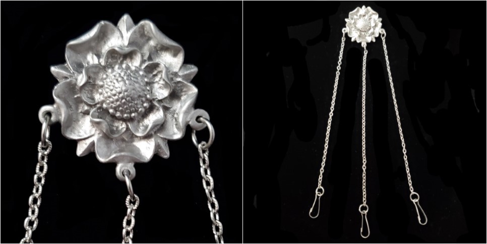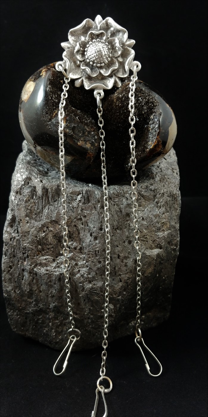 Measures 1-3/4" x 1-3/4", there are 3 hanging 6" heavy duty stainless steel chains and lanyard clips.