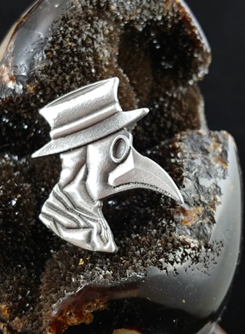 Plague DR: The ominous outfit of the “Plague Doctor” originates in 17th century Europe. Dr. Charles De Lorme is credited for the design of the protective gear meant to keep the physician safe from airborne particulates. The outfit includes a waxed coat, breechs, shirt and boots; everything was too be tucked in and secure. The most notable pieces of protective gear however were the head gear: hat, mask and gloves made of goat leather.