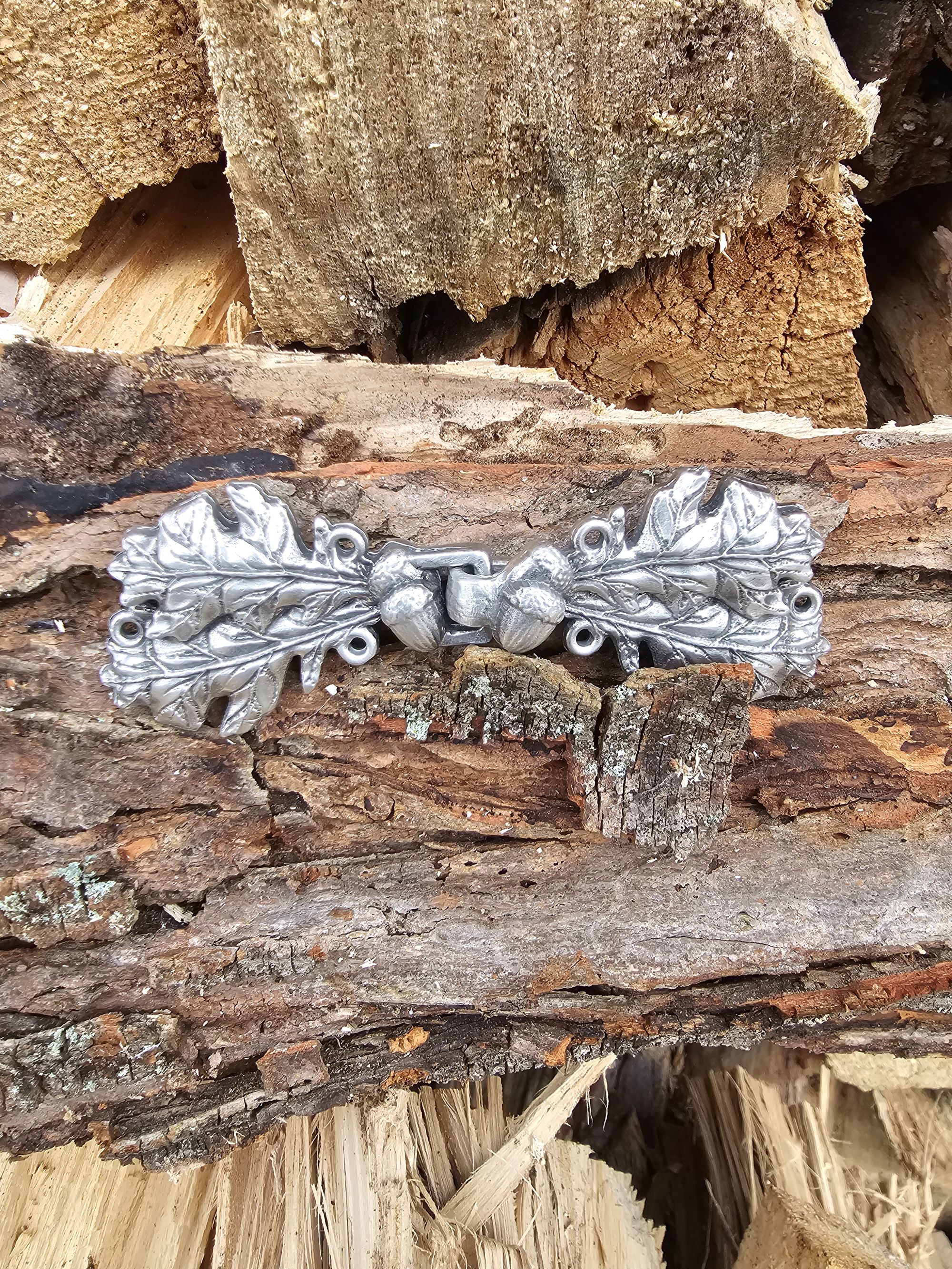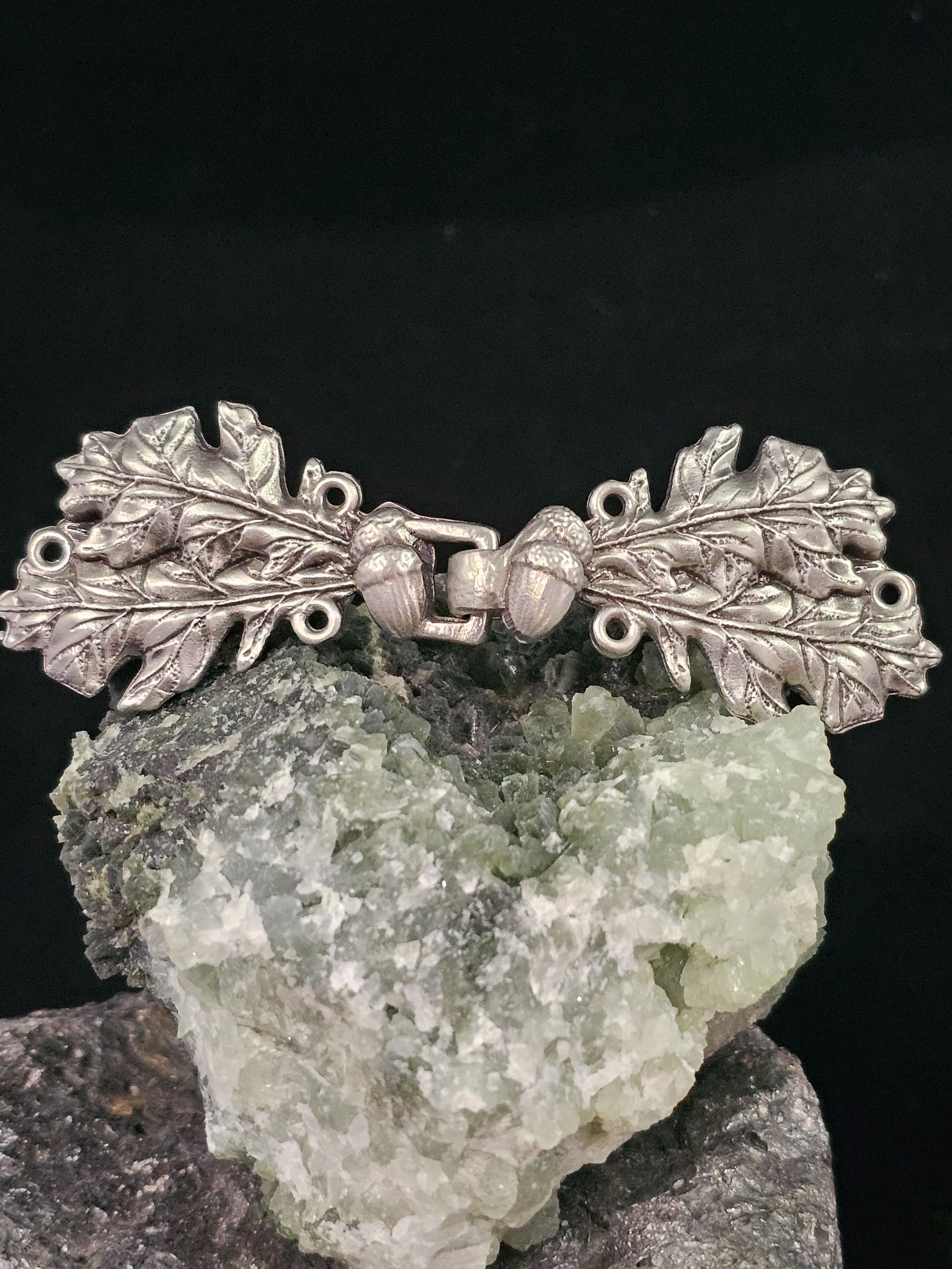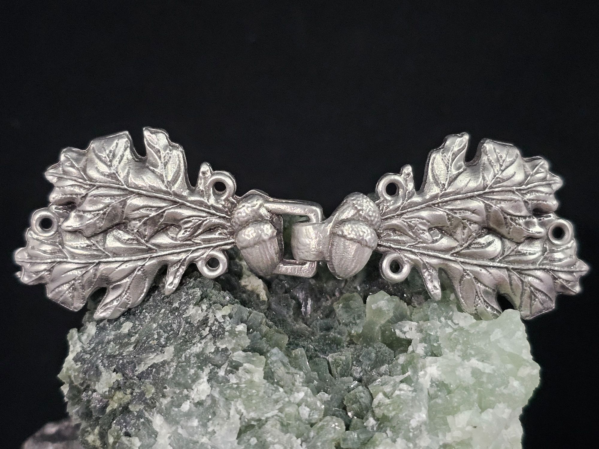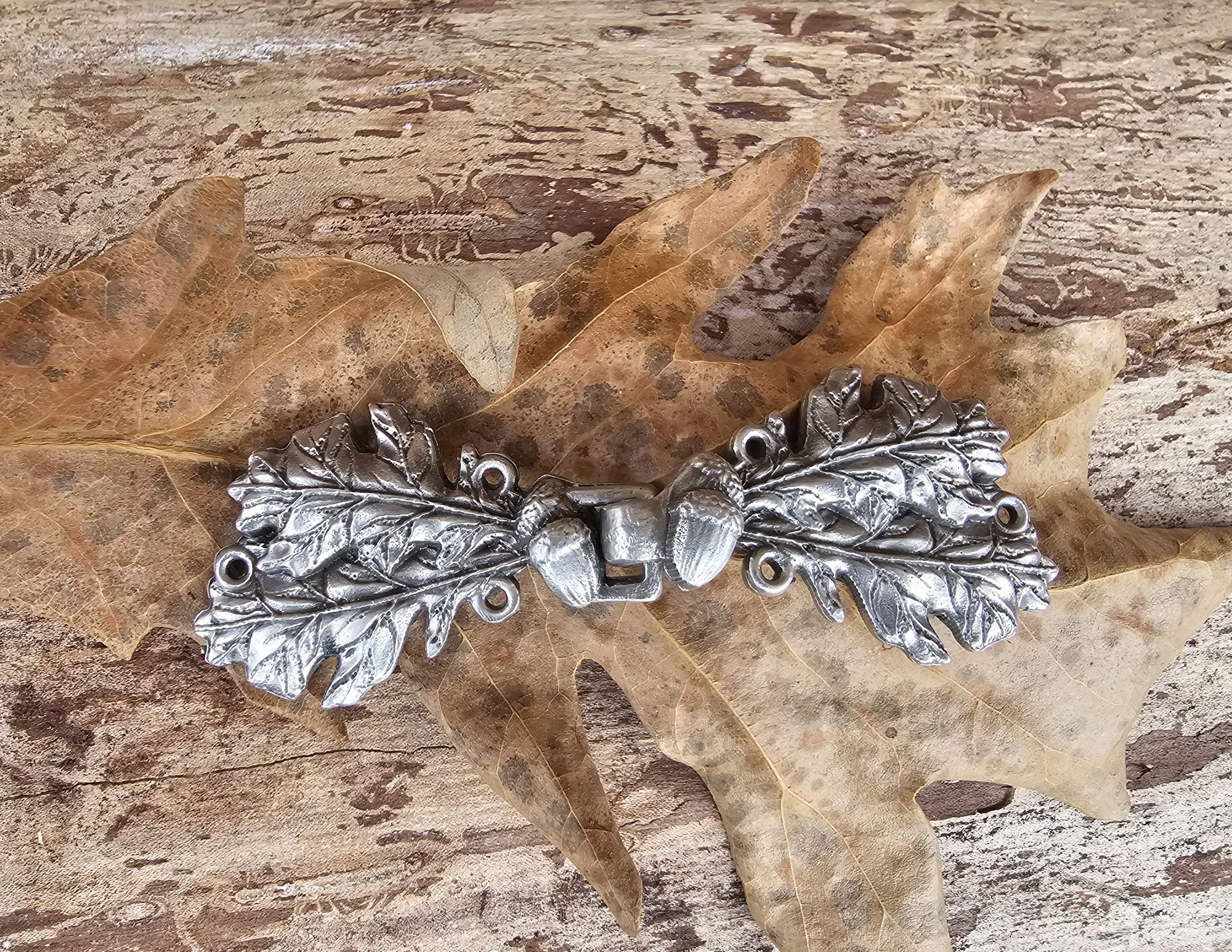 New design, this magical oakleaf cloak clasp is a perfect addition to your heavy weight cloak. Each side of the clasp has three loops for easy sew-in attachment. The hand cast pewter clasp has a secure hook/latch designed closure. Oak leaves symbolize strength, wisdom, and endurance.