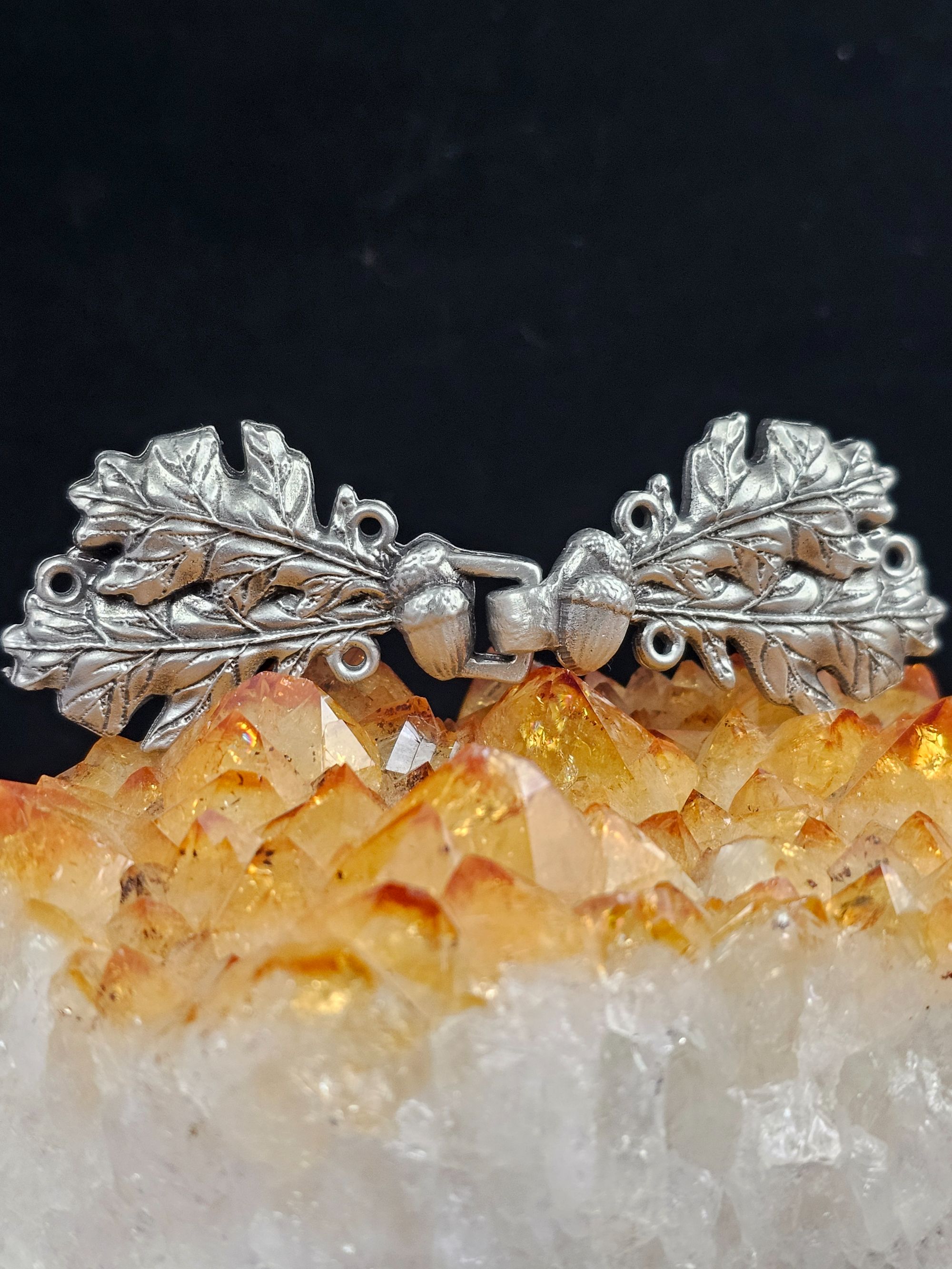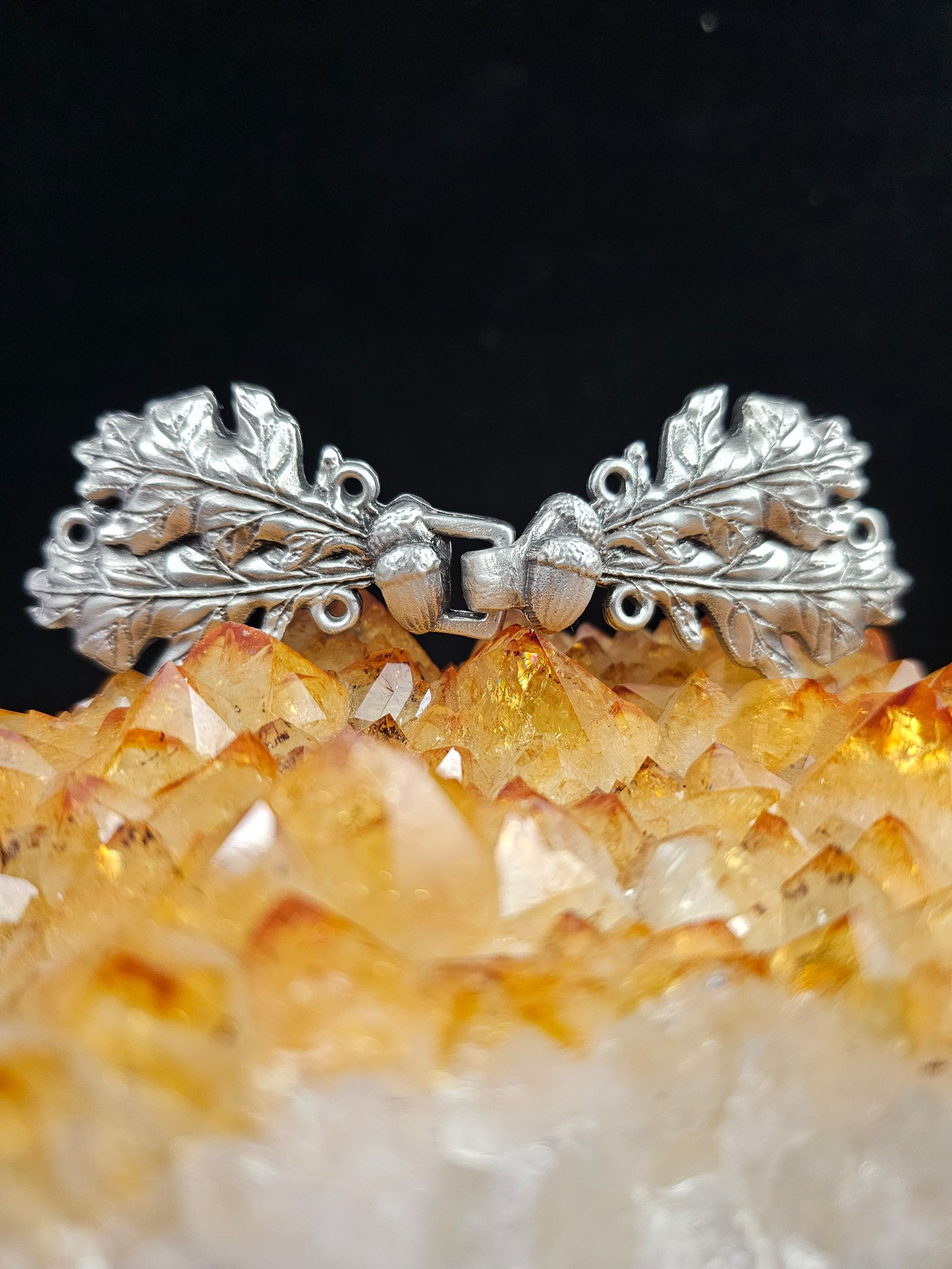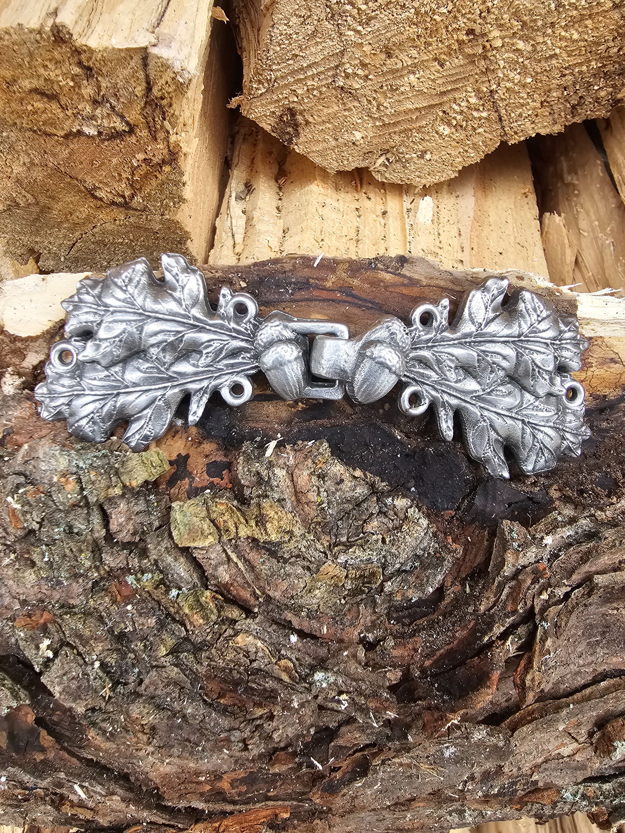 New design, this magical oakleaf cloak clasp is a perfect addition to your heavy weight cloak. Each side of the clasp has three loops for easy sew-in attachment. The hand cast pewter clasp has a secure hook/latch designed closure. Oak leaves symbolize strength, wisdom, and endurance.
