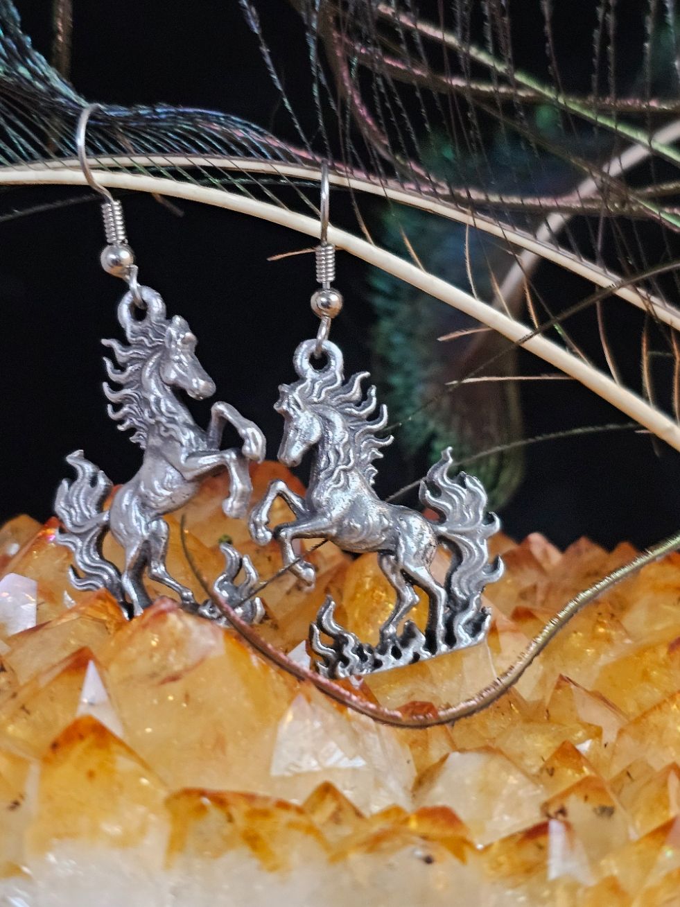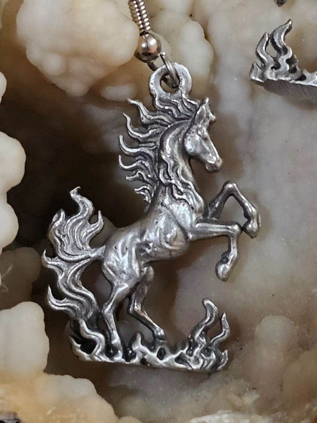 Cast in lead free pewter this stunning fire horse is ready to lead you into your new adventures. The earring charms are double sided and measure 1 1/4" X 7/8" the earring wires are surgical steel. Special note: these will be a bit heavier than commercially sold earrings.