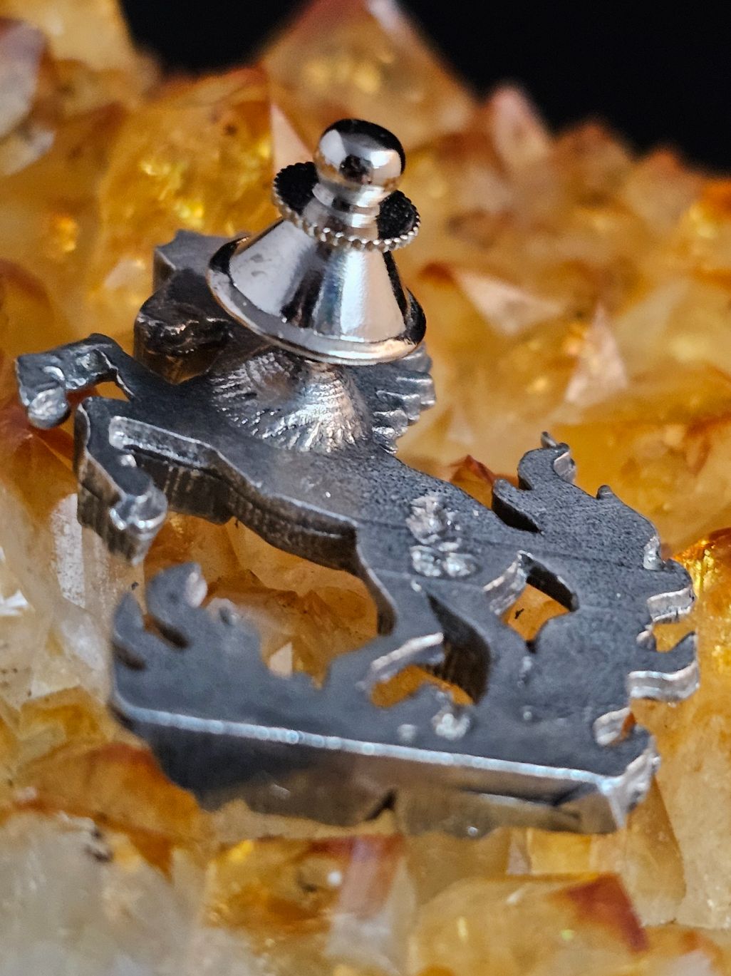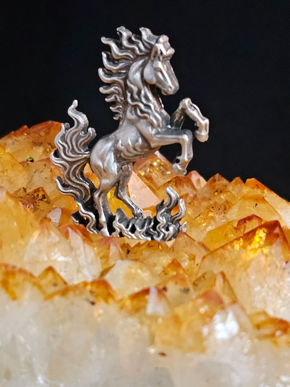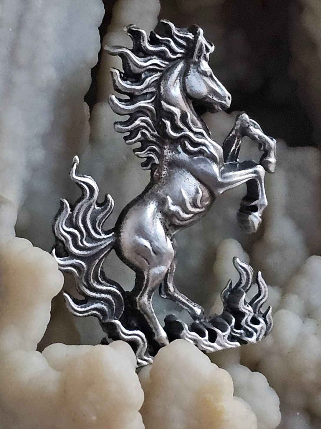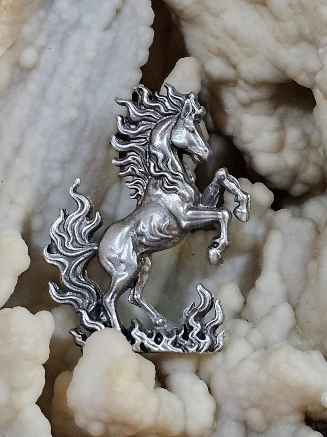 Cast in lead free pewter this stunning fire horse is ready to lead you into your new adventures. The pin measures 1 1/2" X 1 1/4" and has a locking pin caps. Also available in a necklace and earrings!